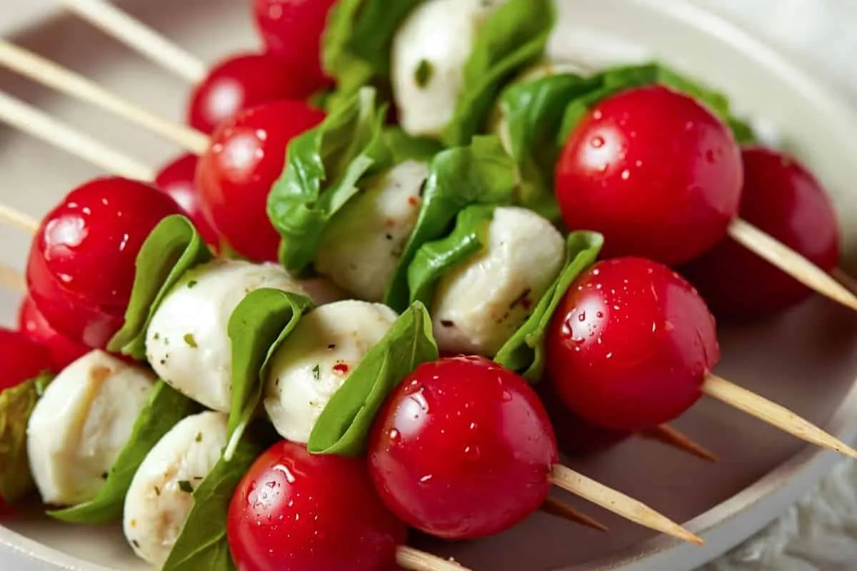 Fresh mozzarella balls, cherry tomatoes, and basil leaves skewered and drizzled with balsamic glaze, served with a sprinkle of sea salt.