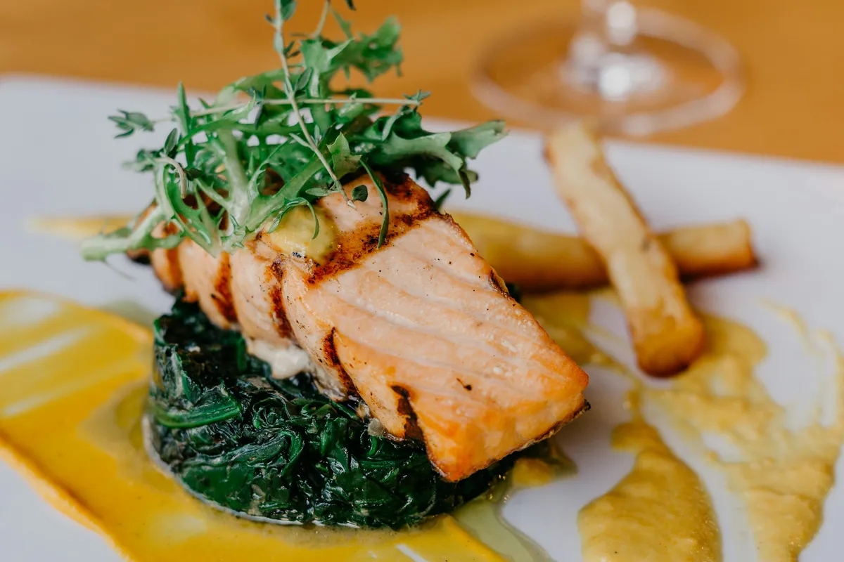 A perfectly grilled salmon fillet served with steamed vegetables and a side of lemon herb quinoa.