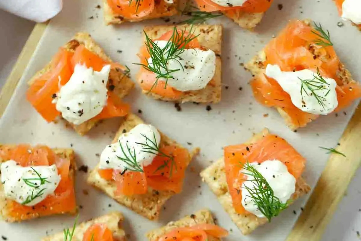 Bite-sized toasts topped with cream cheese, smoked salmon, dill, and a squeeze of lemon juice.